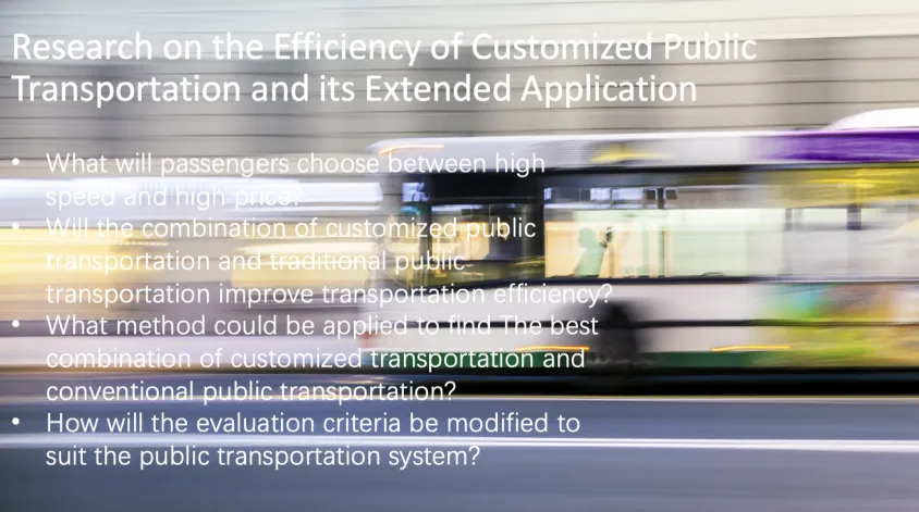 With the continuous growth of public transportation in various cities, public transportation is operating under high pressure. Customized public transportation serves as a new type of public transportation, not only becoming a type that is rapid and comfortable but also facing the challenges of metro and buses. In order to verify the transportation efficiency of the customized transportation, this project will create evaluation criteria based on multiple values and explore the extended applications in more cities and scenarios.